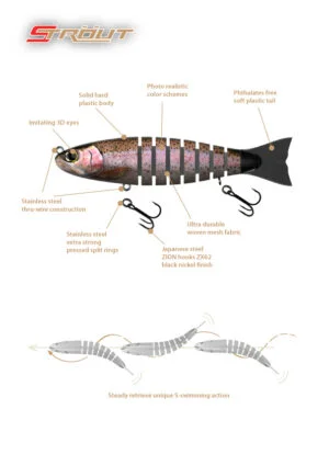 Le design du STrout permet à la tête de nager en ligne droite, le corps suivant le mouvement pour une nage ultra-réaliste. Sa forme imite parfaitement une truite, d’où son nom, et en fait le leurre de prédilection des pêcheurs de bar ciblant les spécimens trophées. En modulant la vitesse et le rythme de récupération, vous pouvez facilement imiter un poisson blessé. Que vous recherchiez une nage en S douce ou une oscillation serrée, le design du STrout offre une grande polyvalence pour s’adapter aux conditions de pêche. Si vous recherchez un swimbait ultra-réaliste capable de tromper même les poissons les plus méfiants, le STrout est fait pour vous.